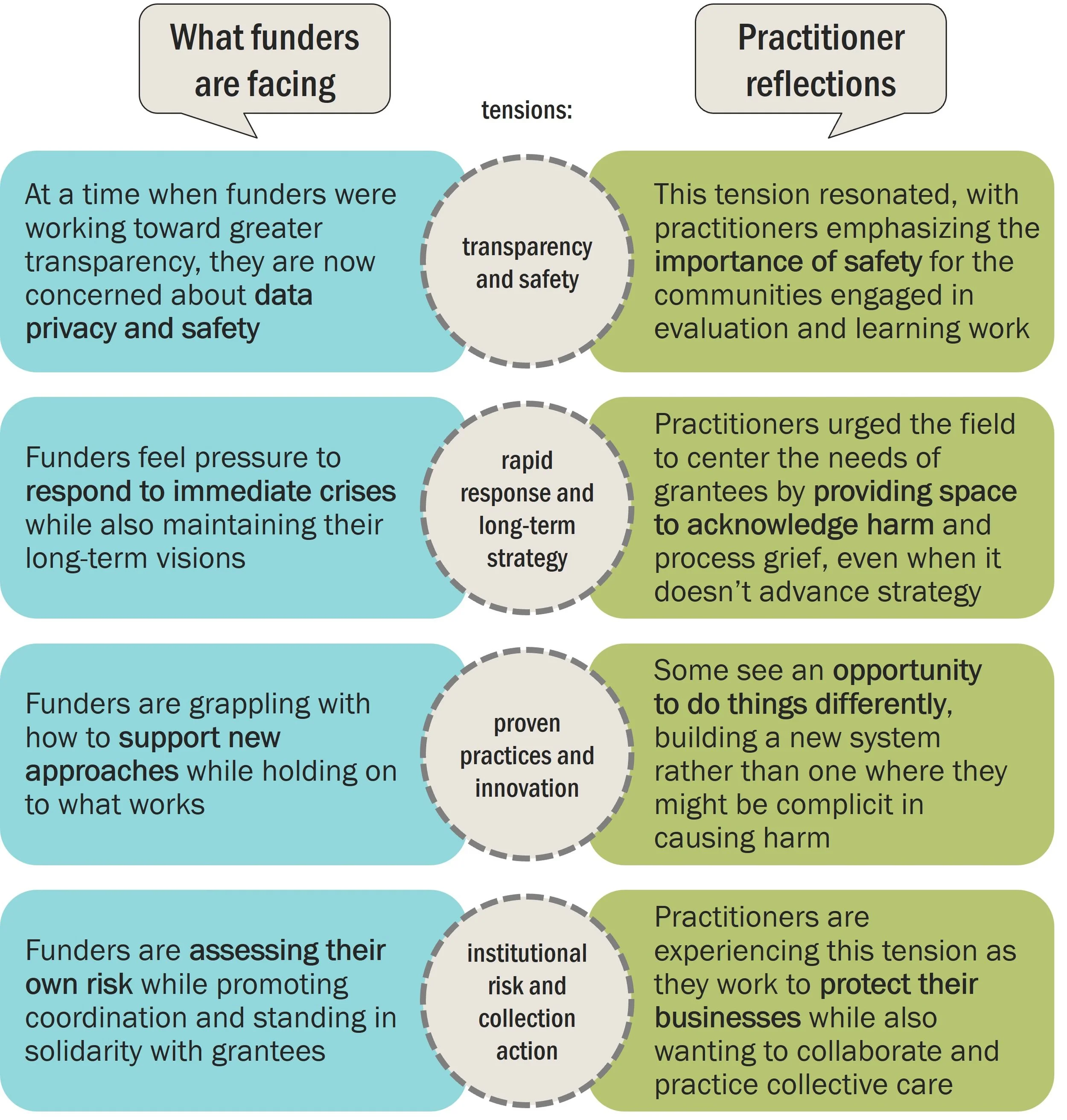 Navigating this context has created several tensions and trade-offs in the practice of equity-centered philanthropic evaluation and learning. From our conversations with funders, we described the four main tensions reproduced below. These resonated with evaluation practitioners, who added additional context and nuance from their perspectives: