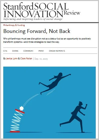 When crises hit, philanthropy often defaults to stabilizing what exists—filling gaps and restoring normalcy. But what if disruption could be a portal to something better? In this Stanford Social Innovation Review article, we argue that funders can use moments of turmoil to advance lasting systems change. Drawing on lessons from The James Irvine Foundation's Fair Work initiative—where pandemic disruption led to a permanent shift in California's worker protection infrastructure—we outline three strategies for "bouncing forward": shifting mindsets from crisis response to strategic opportunity, sharing power by letting communities guide direction, and acting boldly to fund systemic change rather than stopgaps.