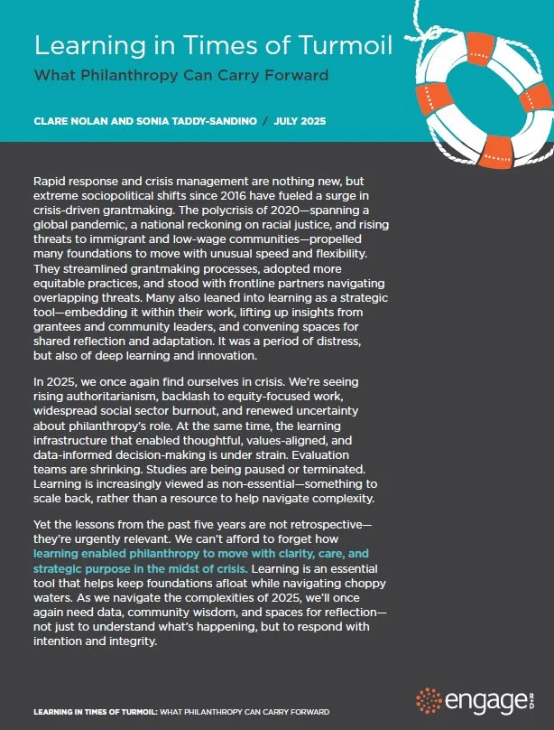 Engage R+D Companion Brief: Five lessons from four major philanthropic crisis responses showing how learning helps philanthropy move from reaction to strategic action.