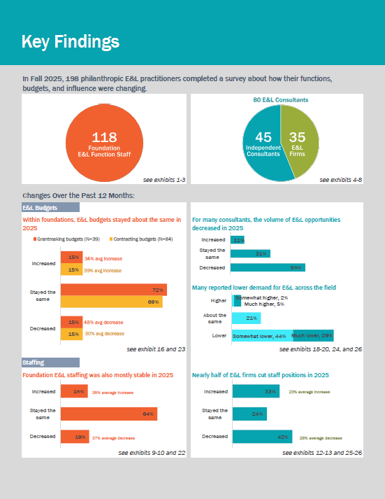 Across philanthropy, people working in evaluation and learning are navigating a period of uncertainty. As foundations respond to shifts in federal policy, pressure on equity-focused work, and rapid changes in technology, many E&L functions are changing in scope, structure, and influence. For the consultants and firms foundations partner with, those changes are showing up even more acutely.