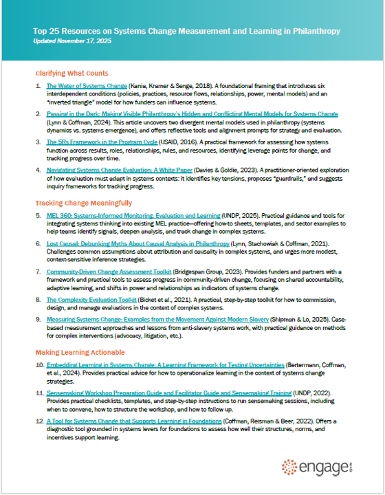 Top 25 Systems Change Resources curates essential readings, frameworks, and tools organized by the learning agenda themes. From foundational framings like The Water of Systems Change to practical toolkits for sensemaking and participatory evaluation, this collection makes useful materials easier to find and signals the kinds of knowledge products the field needs most.